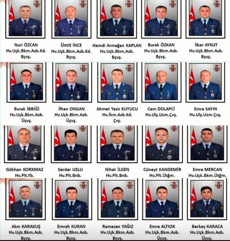 Şehit Hv. Plt. Yb. Gökhan Korkmaz İstanbul’da, Şehit Hv. Plt. Bnb. Serdar Uslu Bursa, Şehit Hv. Plt. Bnb. Nihat İlgen Kayseri, Şehit Hv. Plt. Ütğm. Cüneyt Kandemir, Şehit Hv. Ulş. Uzm. Çvş. Cem Dolapci Ankara, Şehit Hv. Uçk. Bkm. Asb. Kd. Bçvş. Ümit İnce, Şehit Hv. Plt. Ütğm. Emre Mercan Eskişehir, Şehit Hv. Uçk. Bkm. Asb. Kd. Bçvş. Nuri Özcan Karabük, Şehit Hv. Uçk. Bkm. Asb. Kd. Bçvş, Şehit Hv. Uçk. Bkm. Asb. Bçvş. Burak Özkan Niğde, Şehit Hv. Uçk. Bkm. Asb. Bçvş. Hamdi Armağan Kaplan Amasya, Şehit Hv. Uçk. Bkm. Asb. Bçvş. Akın Karakuş Sakarya, Şehit Hv. Uçk. Bkm. Asb. Bçvş. İlker Aykut Tekirdağ, Şehit Hv. Uçk. Bkm. Asb. Bçvş. Emrah Kuran Muğla, Şehit Hv. Uçk. Bkm. Asb. Bçvş. Ramazan Yağız Bursa, Şehit Hv. Uçk. Bkm. Asb. Üçvş. Emre Altıok Samsun, Şehit Hv. Uçk. Bkm. Asb. Üçvş. İlhan Ongan Bilecik, Şehit Hv. Uçk. Bkm. Asb. Üçvş. Berkay Karaca Kırklareli, Şehit Hv. Uçk. Bkm. Asb. Üçvş. Burak İbbiği Çorum, Şehit Hv. İkm. Asb. Kd. Çvş. Ahmet Yasir Kuyucu Konya, Şehit Hv. Ulş. Uzm. Çvş. Emre Sayın Balıkesir